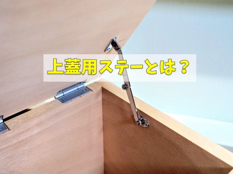 上蓋用ステーには、天蓋用ステー(折り畳みタイプ)・ワンタッチステー・機能付きステー(ソフトダウンステーなど)があり、ステーの両端部をそれぞれ上蓋内側と側板内側に取り付けて使用します。